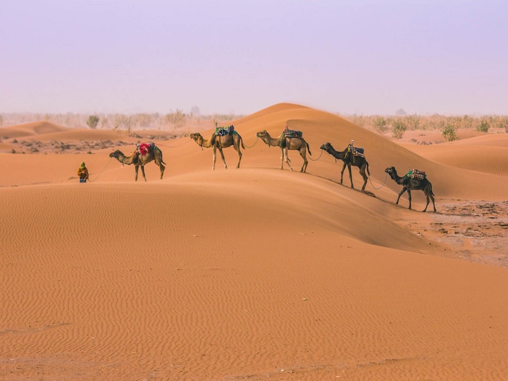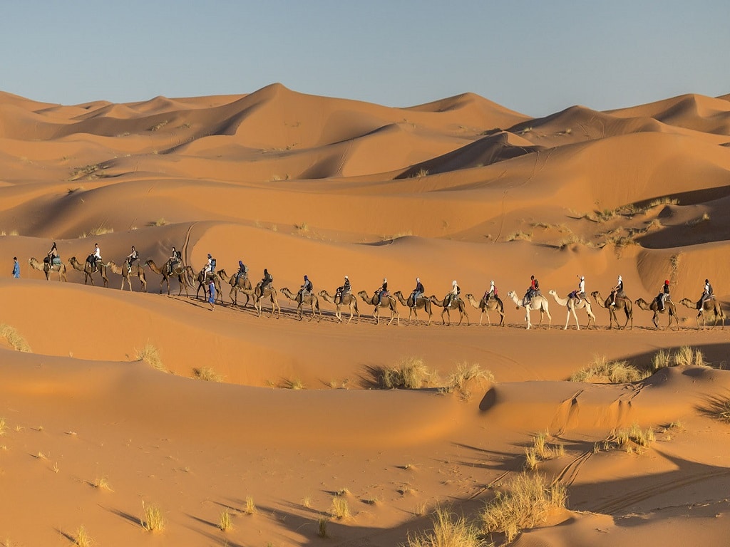 After breakfast, visit the Jewish quarter of Amzerou and its palm grove, we continue our journey to the desert, on the road stop at Tamegroute for the visit of the Koranic library, the underground kasbah and pottery making. Then, continuation to Mhamid, last Village lunch on the spot and we continue by the track of Paris Dakar until the Dunes of Chegaga, this biggest Group of Dunes of the Region reaches a height of 300m on a length of 40km, Arrival at the bivouac, ride dromedary to attend the sunset on the dunes, dinner and traditional nomadic evening with music and songs, night under nomadic tent and the beautiful star